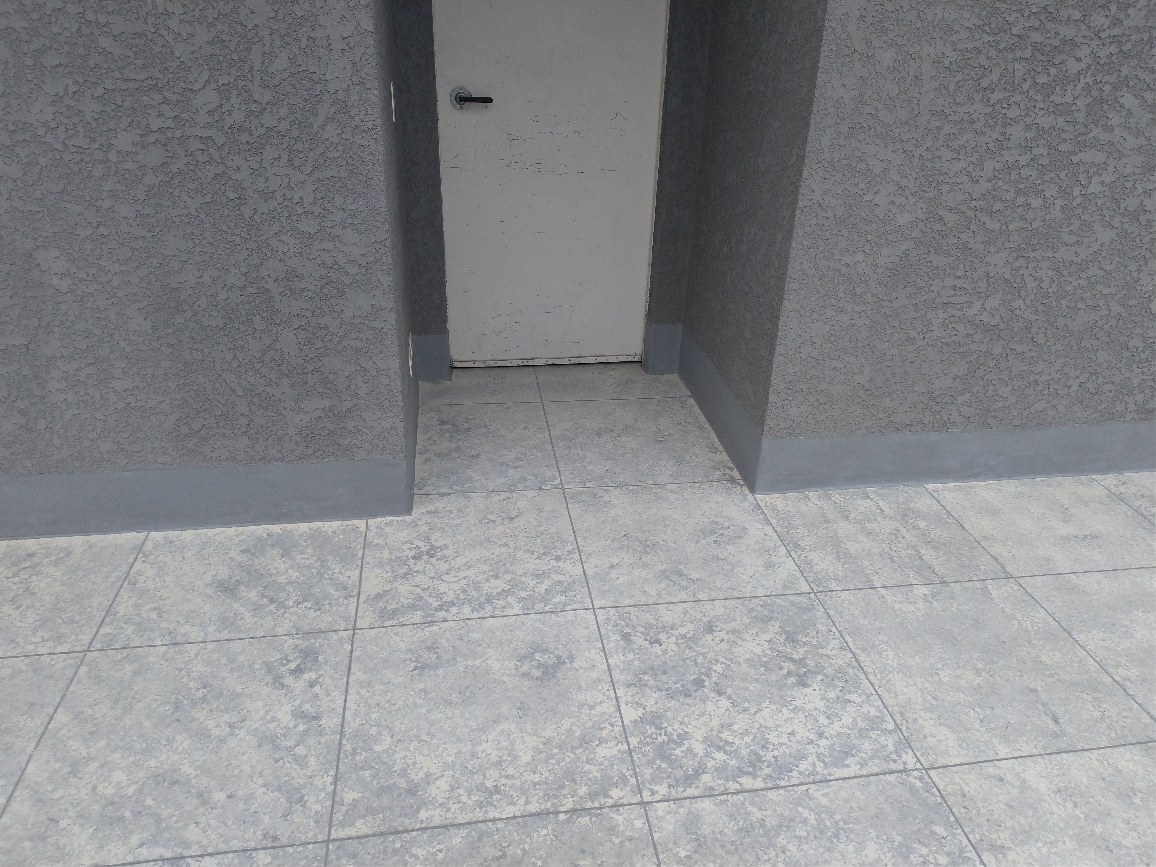O Sistema Fibersals foi aplicado para impermeabilizar o terraço sem a necessidade de quebrar o piso existente, e recebeu o acabamento em gelcoat mesclado com tons de cinza e bege.