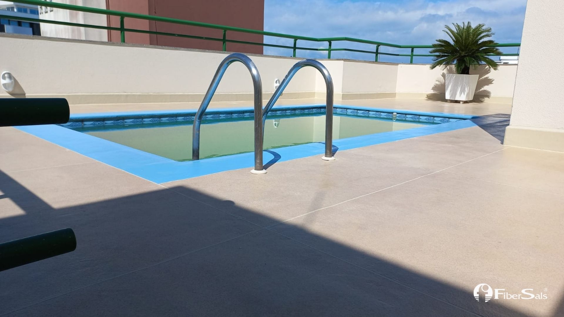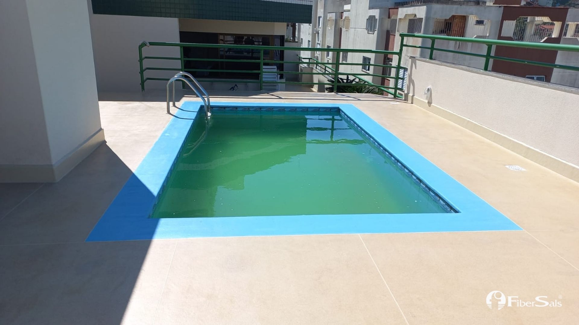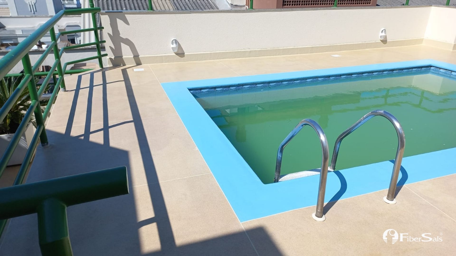 O terraço recebeu acabamento agregado com detalhes em gelcoat flexível. A borda da piscina recebeu acabamento em gelcoat flexível azul.