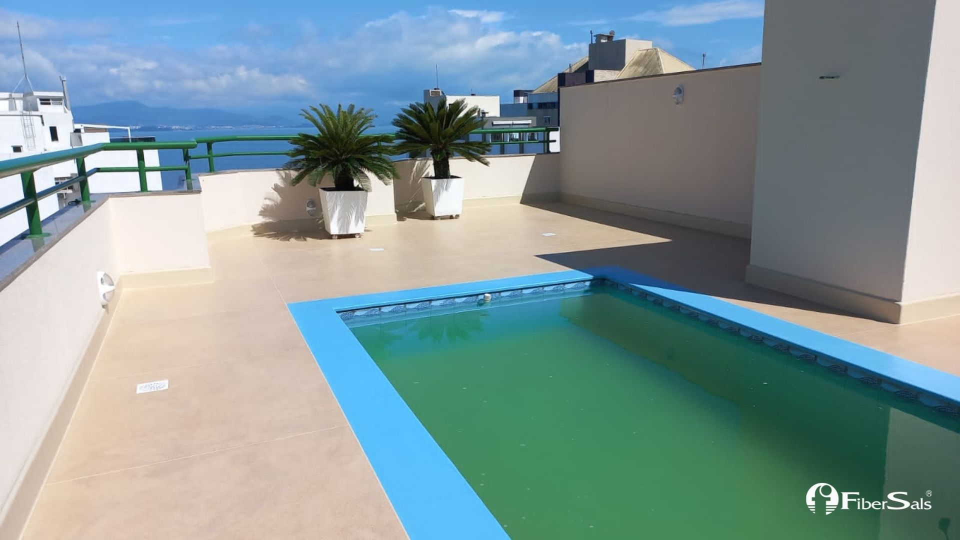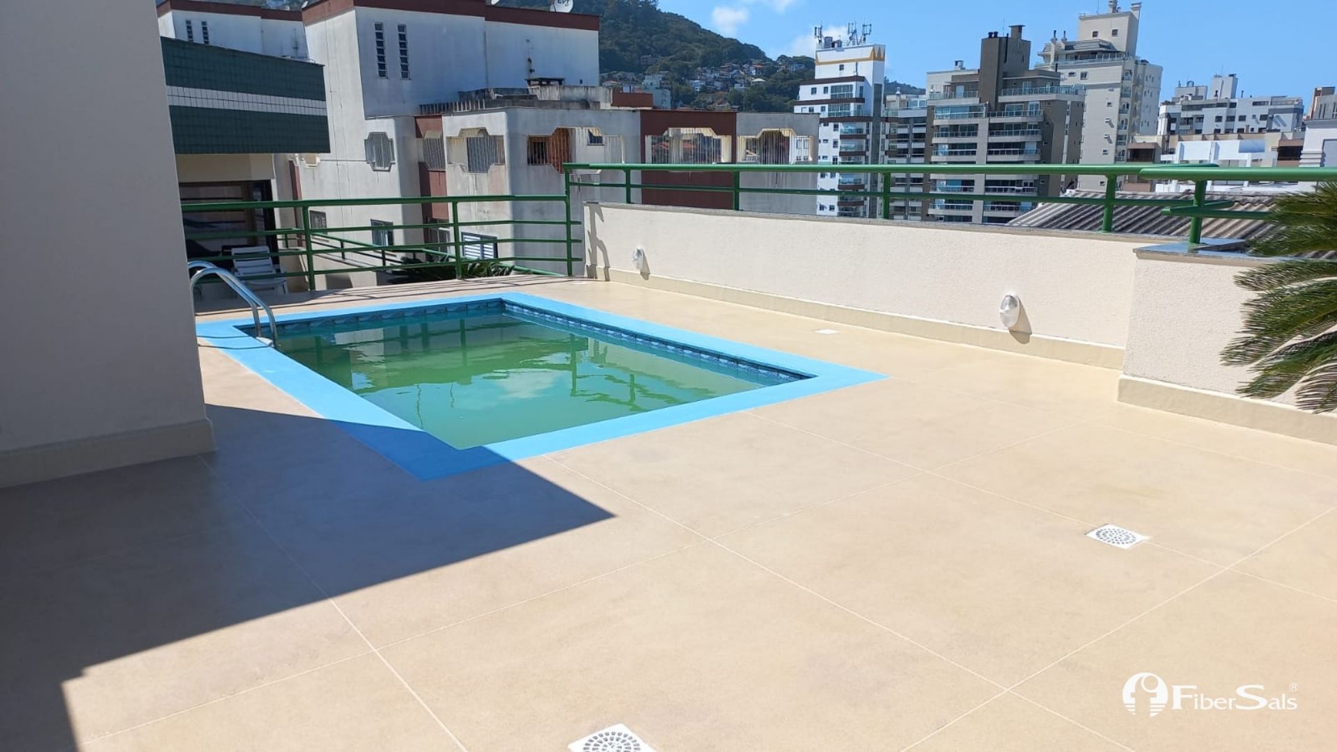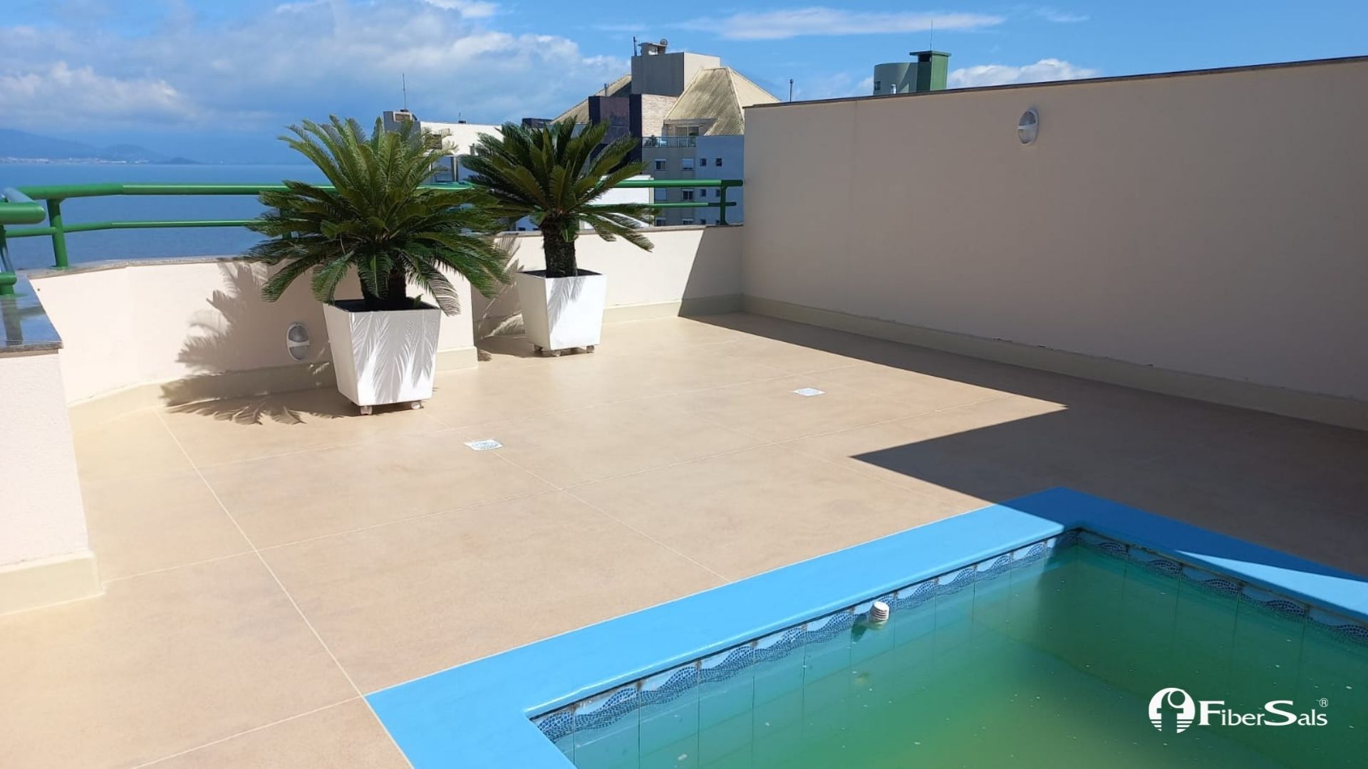 O terraço recebeu acabamento agregado com detalhes em gelcoat flexível. A borda da piscina recebeu acabamento em gelcoat flexível azul.