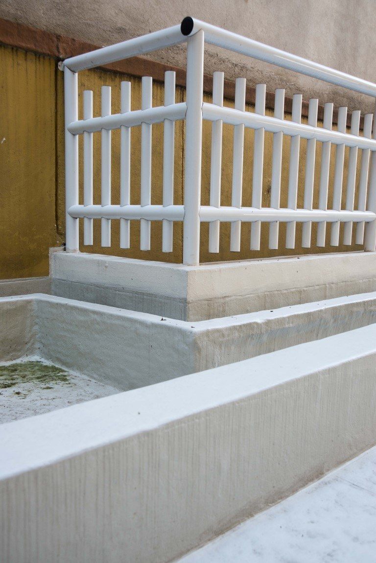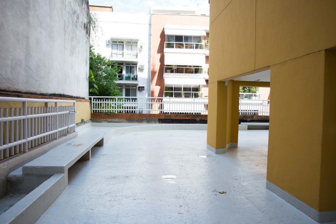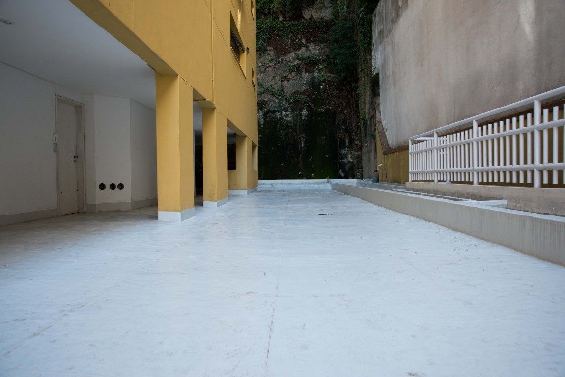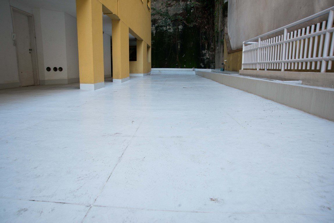 O piso original, de pedra portuguesa, apresentava infiltrações. Um dos pontos levados em consideração pelo condomínio ao optar pelo Sistema Fibersals foi o baixo peso adicionado pela impermeabilização, que é de cerca de 3 kg por m².