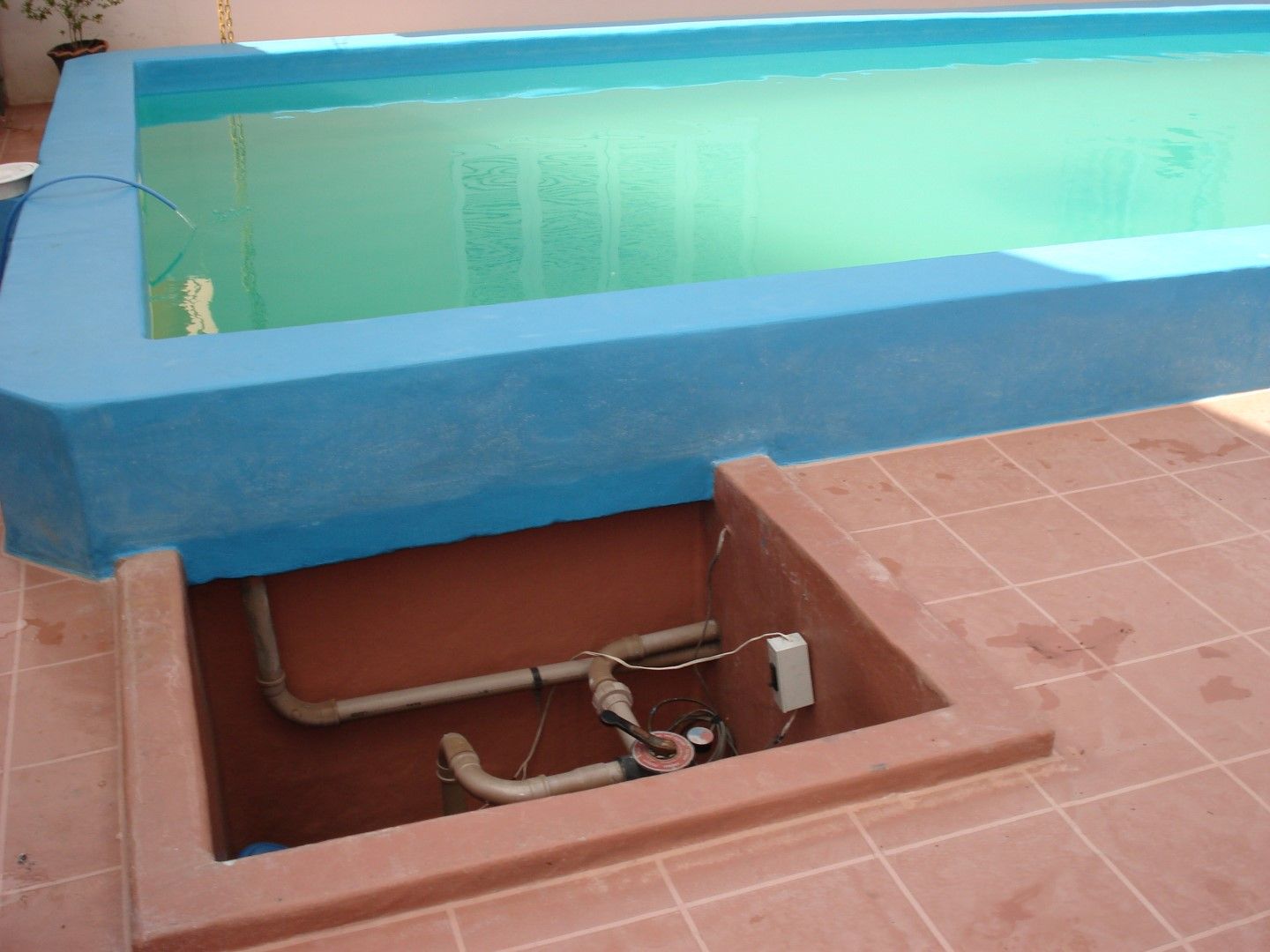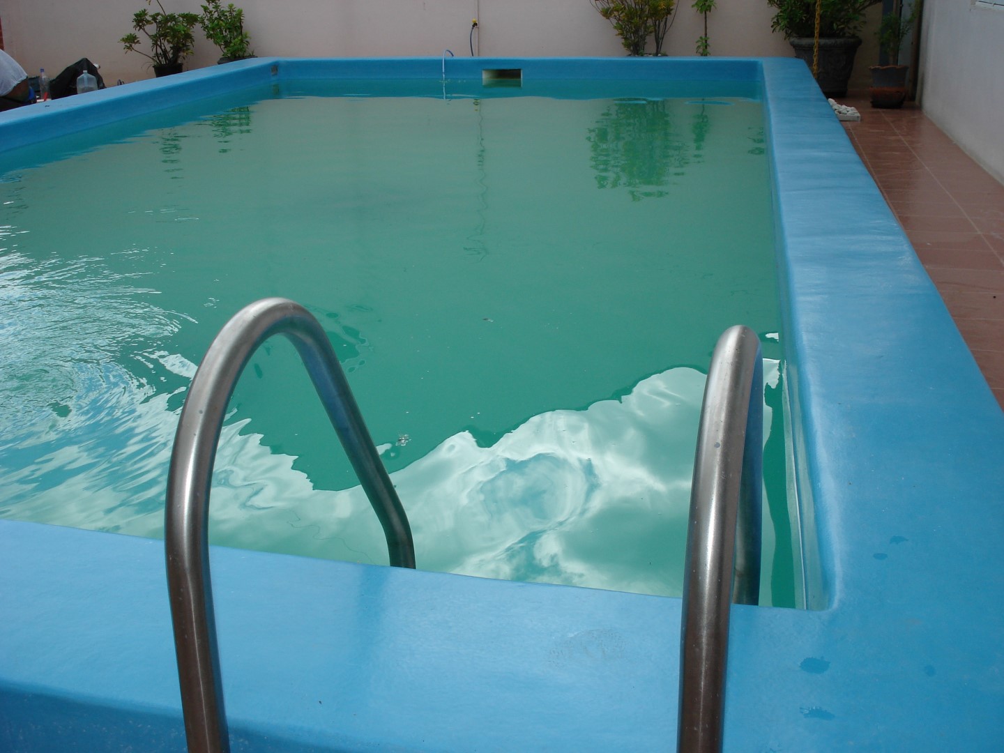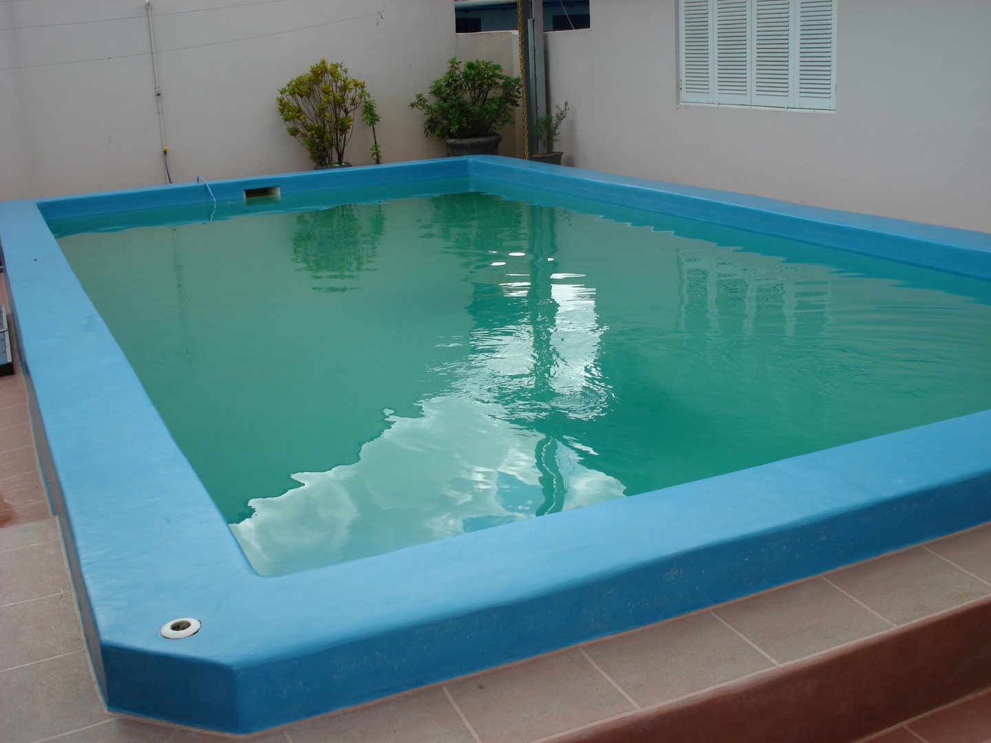 Esta piscina e a área próxima, localizadas em Campo Bom – RS, foram impermeabilizadas pela Fibersals. A piscina recebeu acabamento em azul, e o piso um acabamento imitando cerâmica, com diferenciação de rejunte.