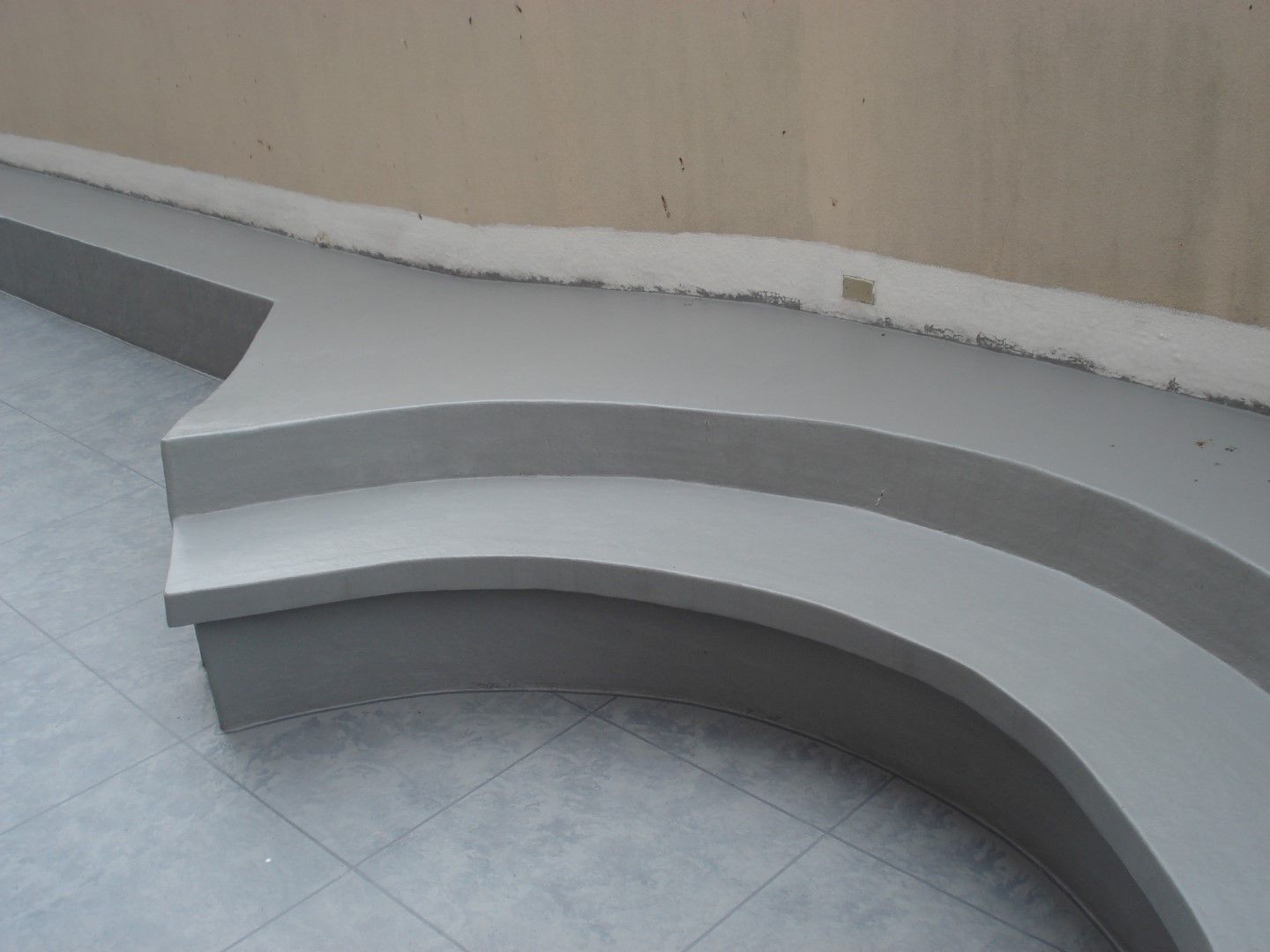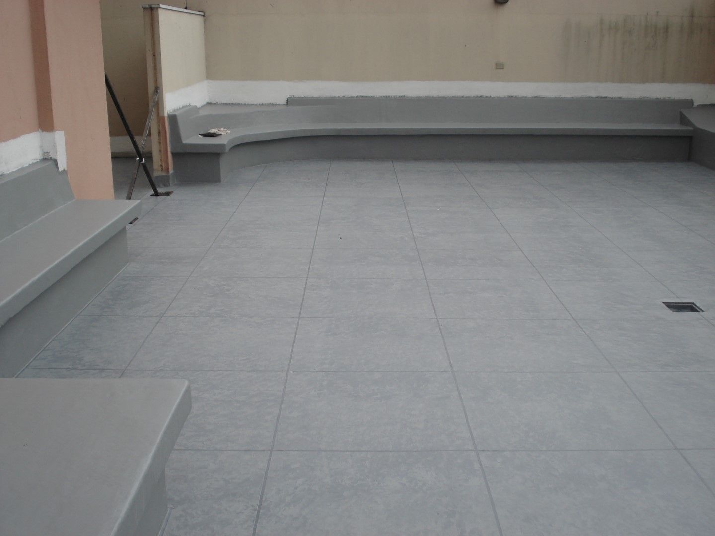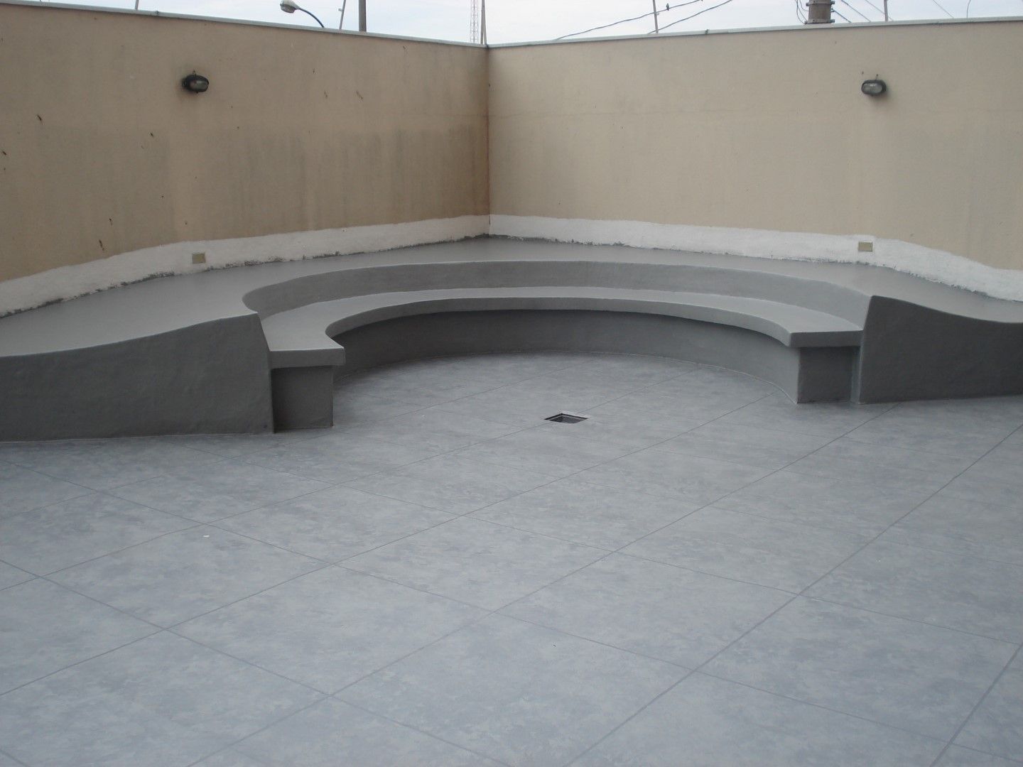 O piso recebeu acabamento mesclado com diferenciação de rejunte e os bancos foram feitos em cor única cinza.
