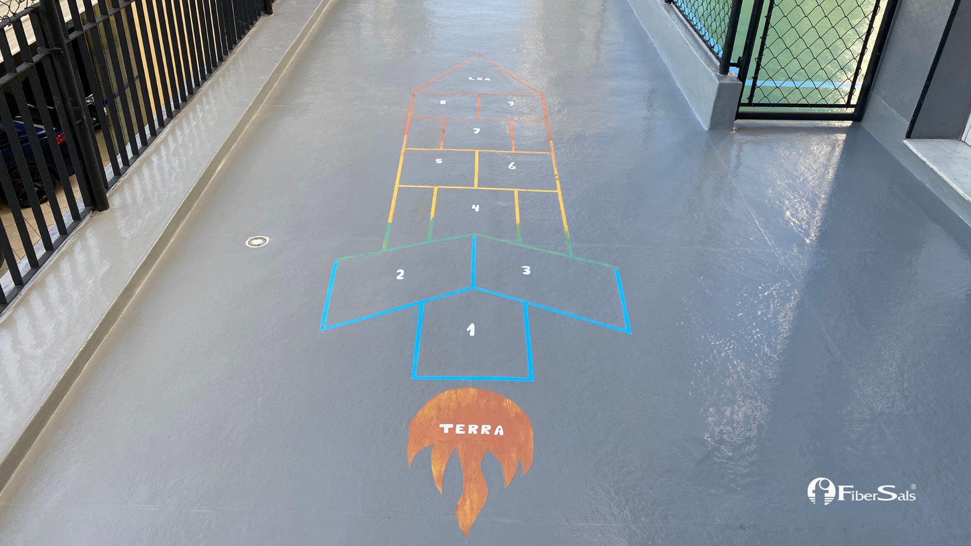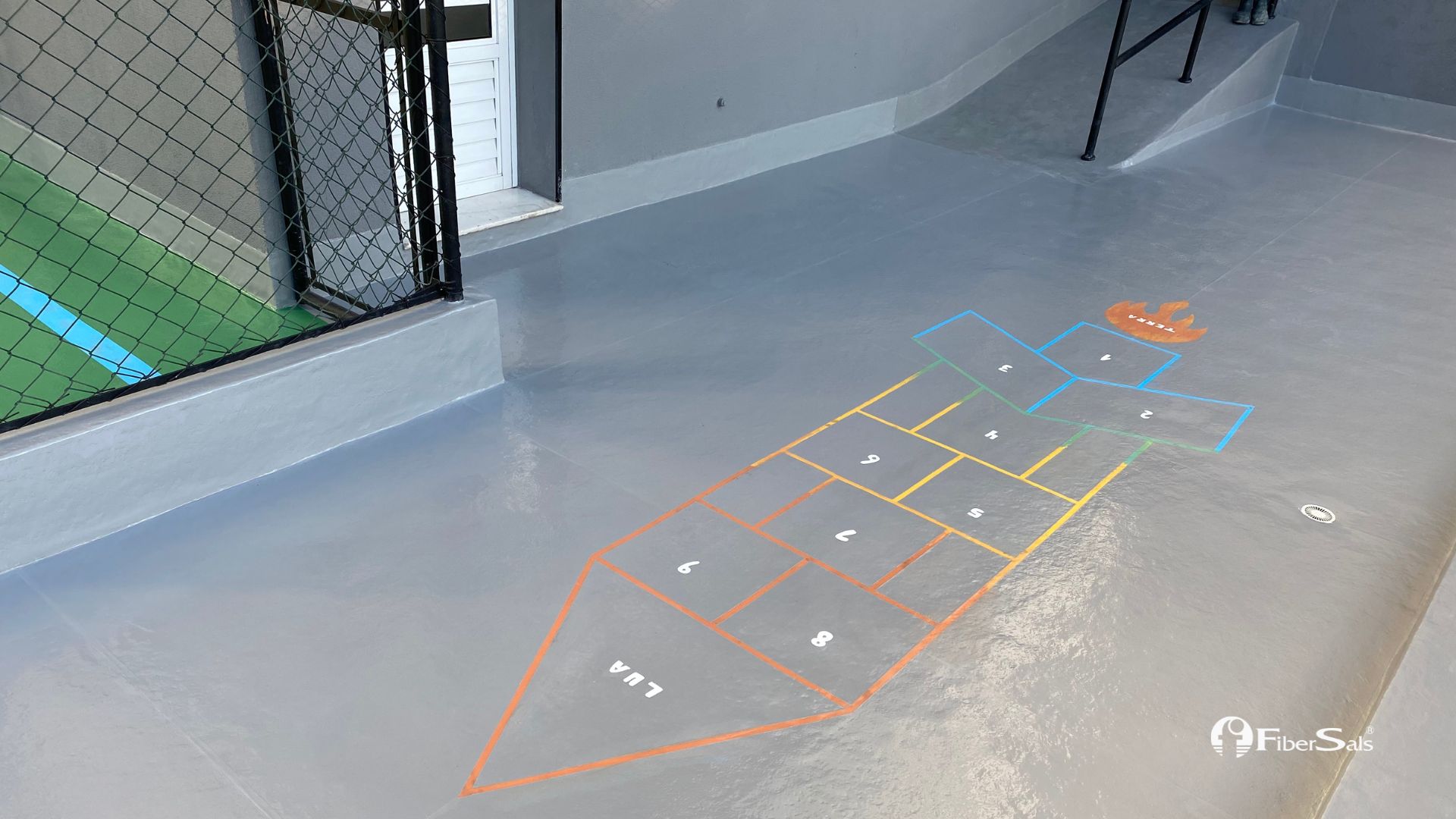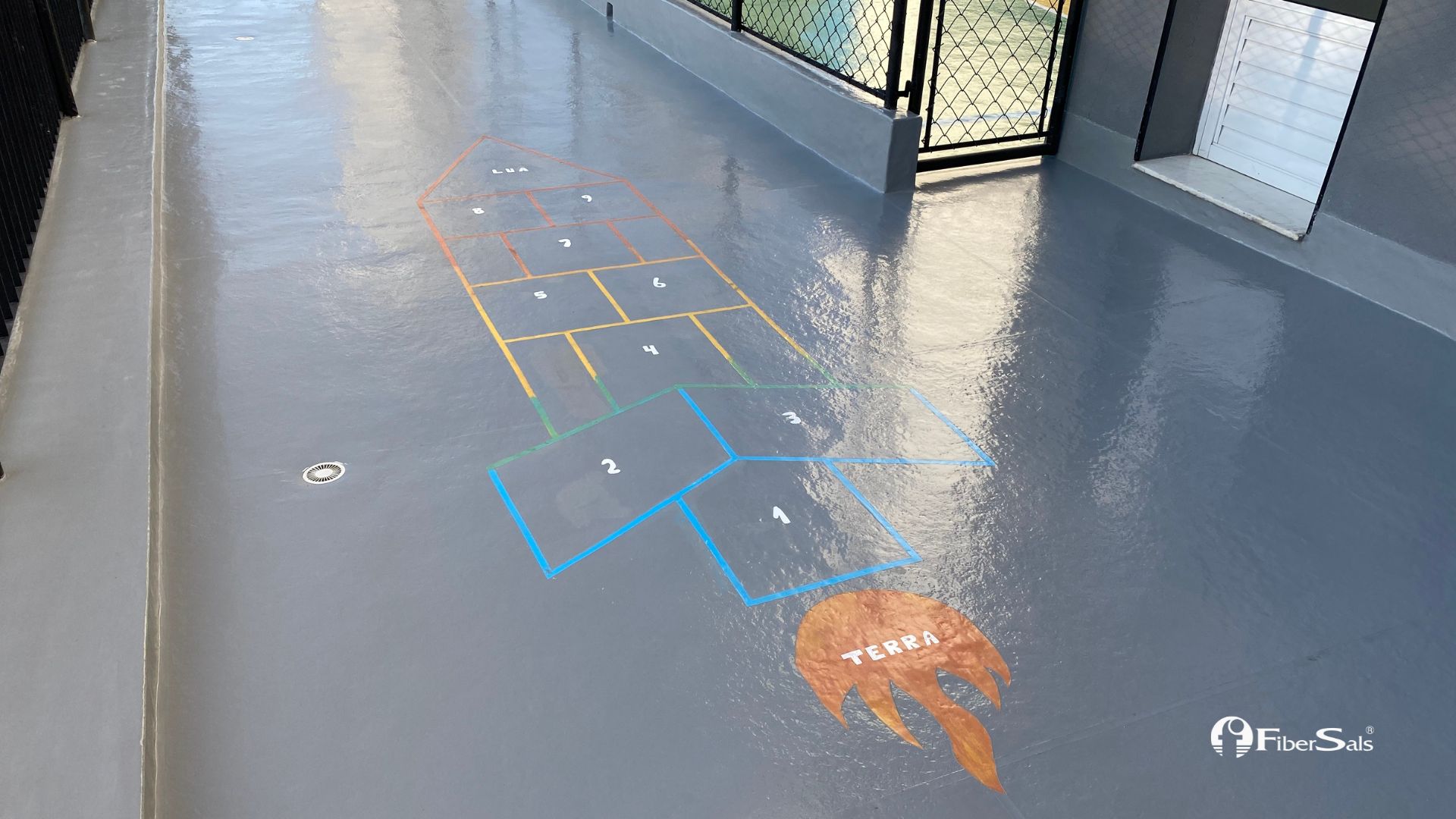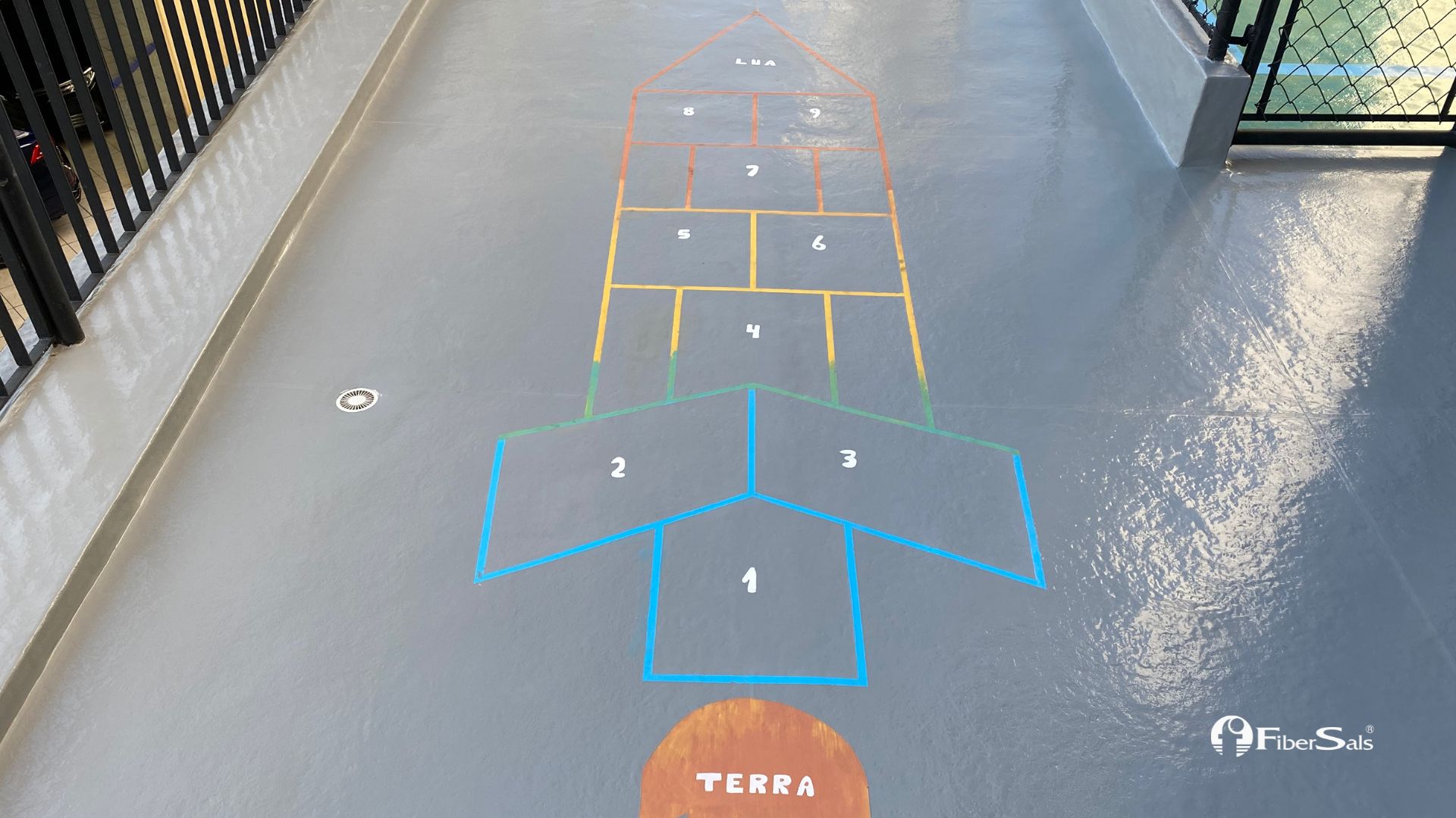 A quadra poliesportiva é adjacente ao playground. A área foi toda revestida com o Sistema Fibersals, com diferentes acabamentos para cada área. A rampa de acesso de pedestres à área, bem como o playground e muretas de contorno receberam acabamento em gelcoat flexível cinza. No playground, foi feita a demarcação, no próprio acabamento do sistema, de uma amarelinha em formato de foguete.