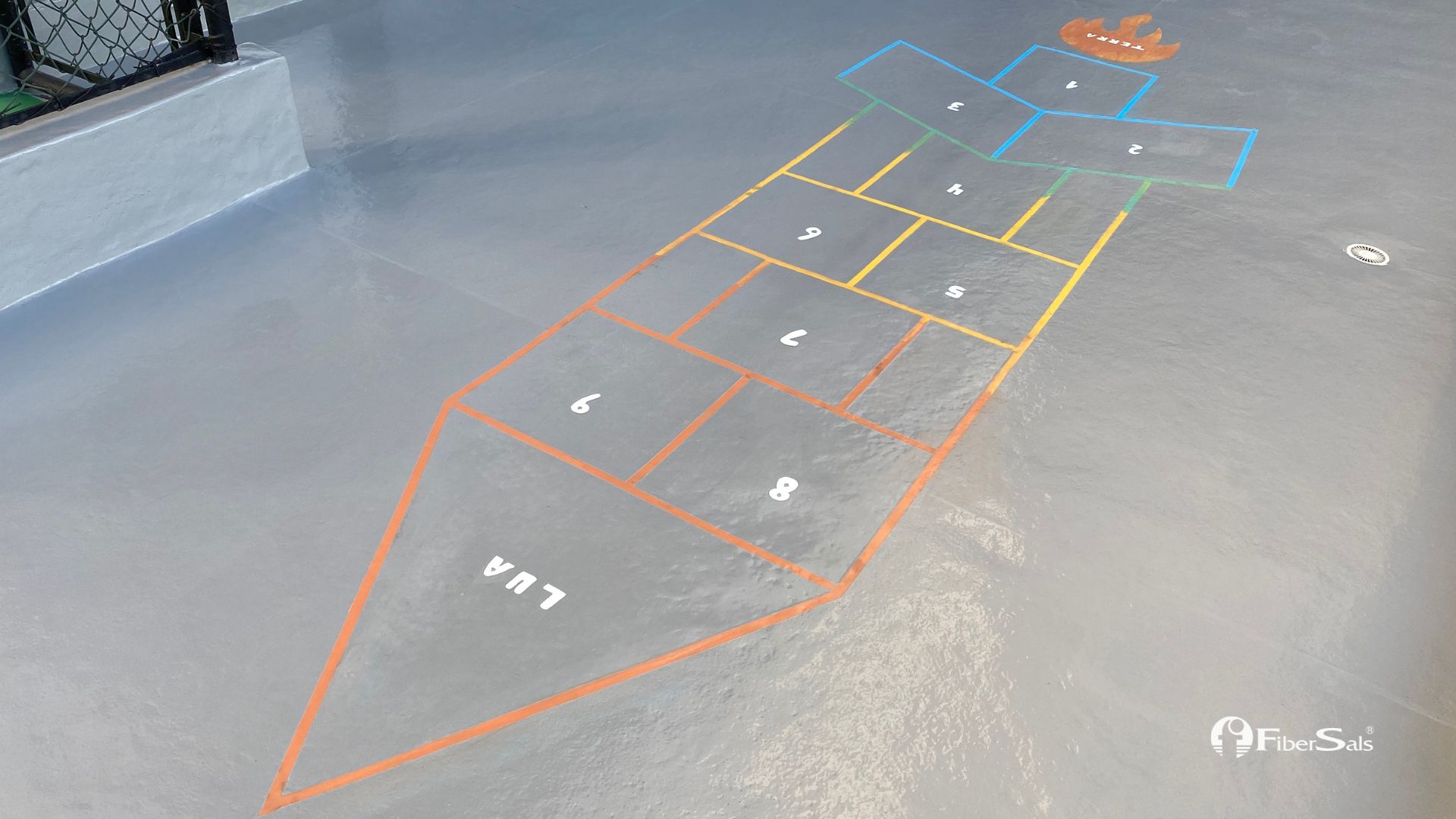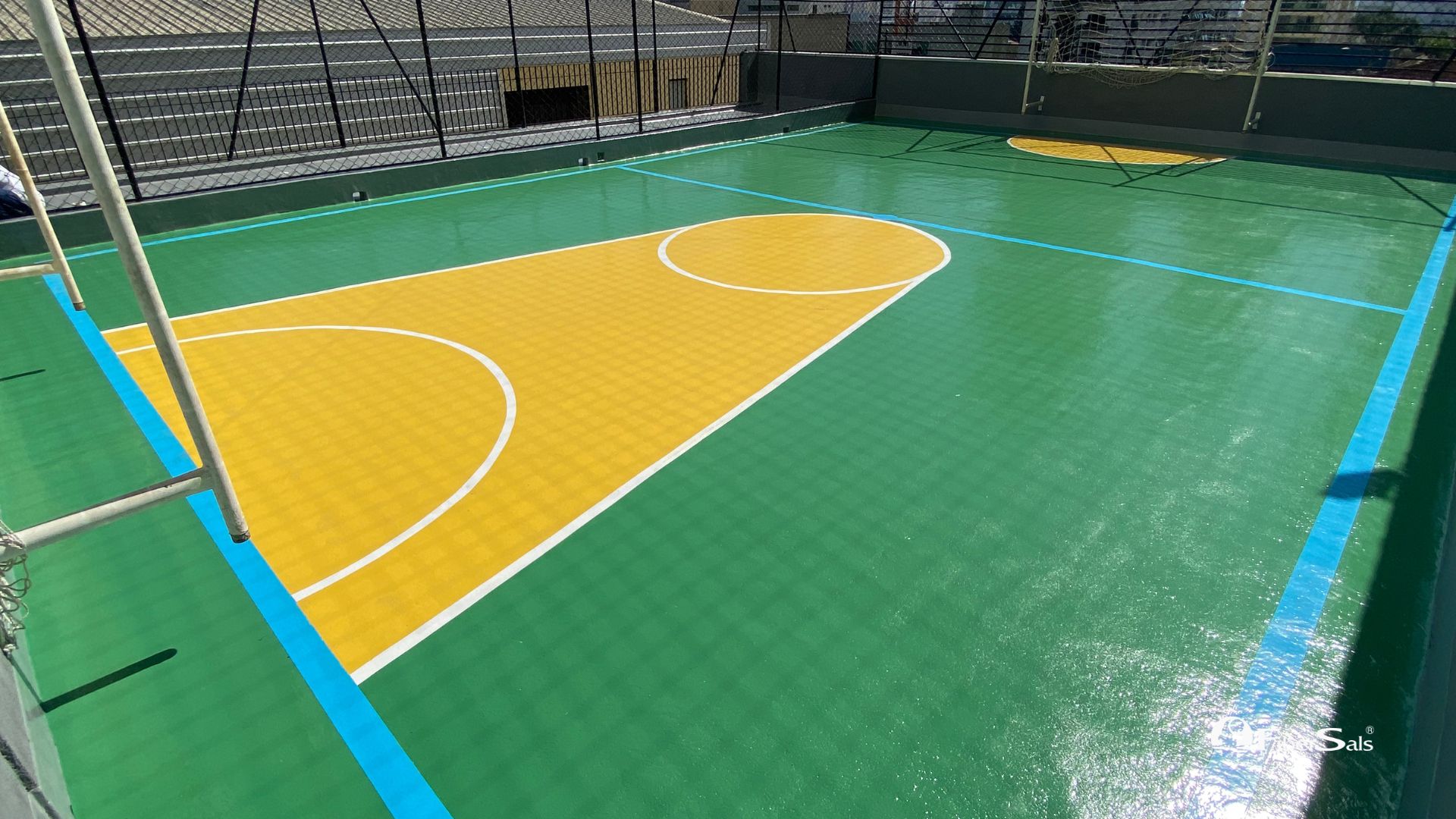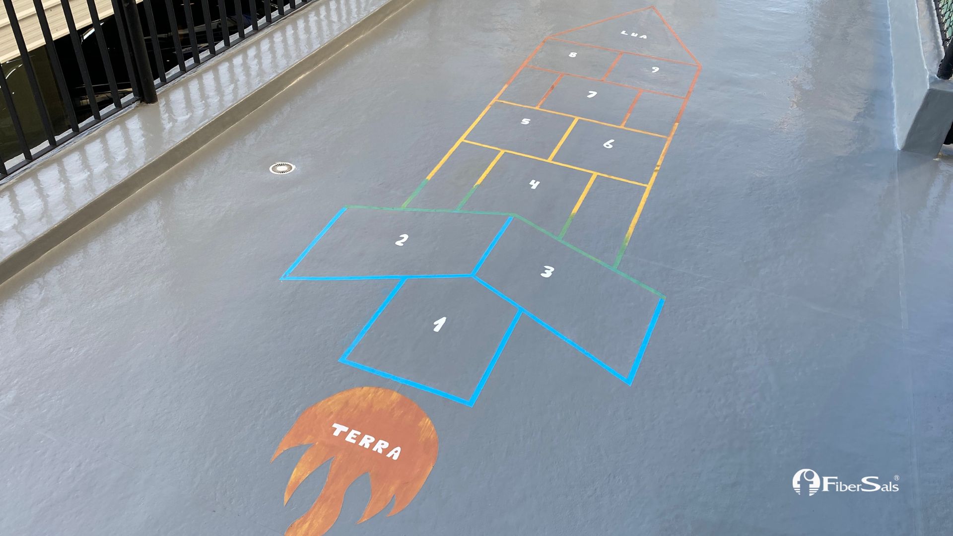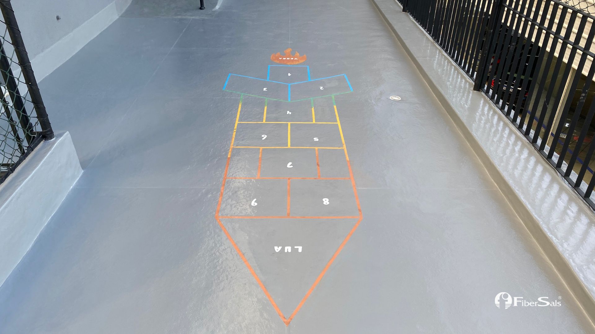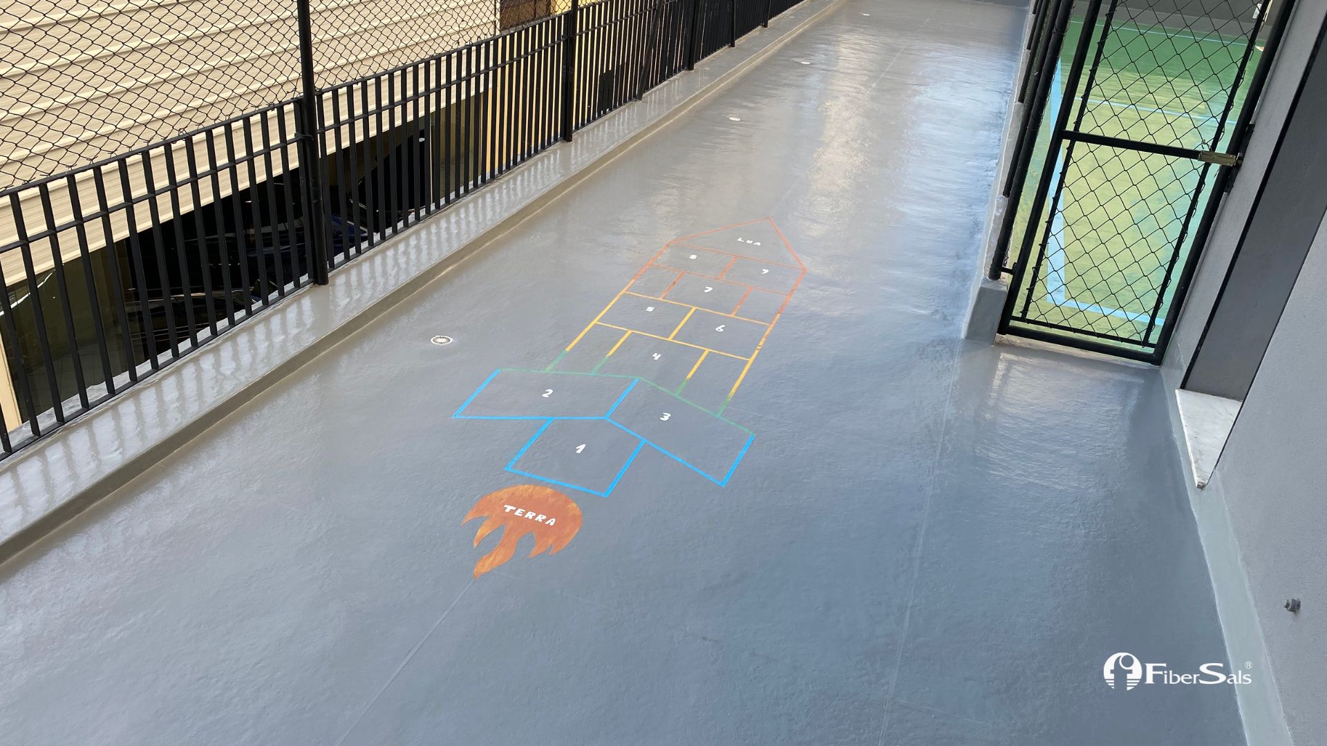 A quadra poliesportiva é adjacente ao playground. A área foi toda revestida com o Sistema Fibersals, com diferentes acabamentos para cada área. A rampa de acesso de pedestres à área, bem como o playground e muretas de contorno receberam acabamento em gelcoat flexível cinza. No playground, foi feita a demarcação, no próprio acabamento do sistema, de uma amarelinha em formato de foguete.