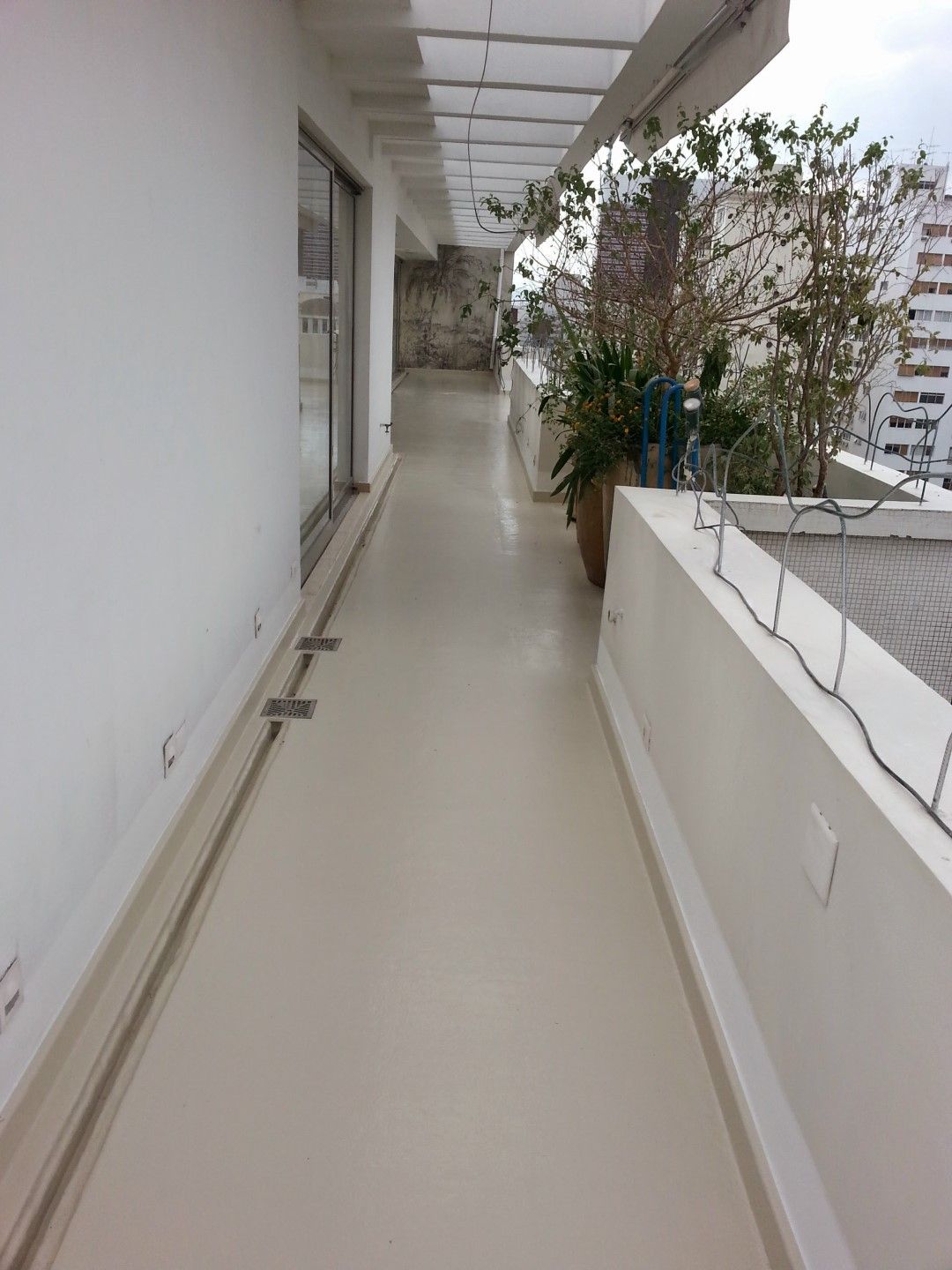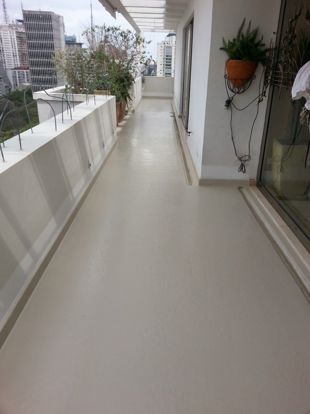 A sacada deste apartamento, próximo à Av. Paulista, em São Paulo – SP, foi impermeabilizada em acabamento cor única bege. O visual da área foi renovado.