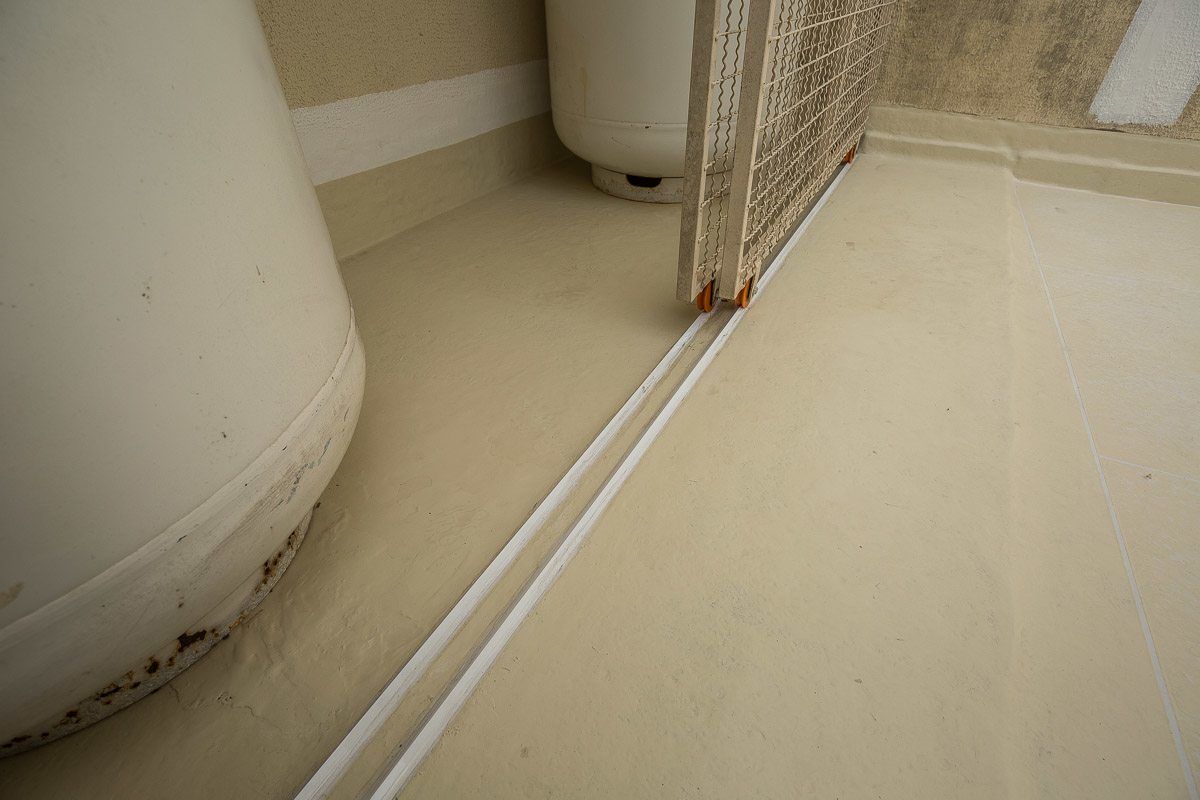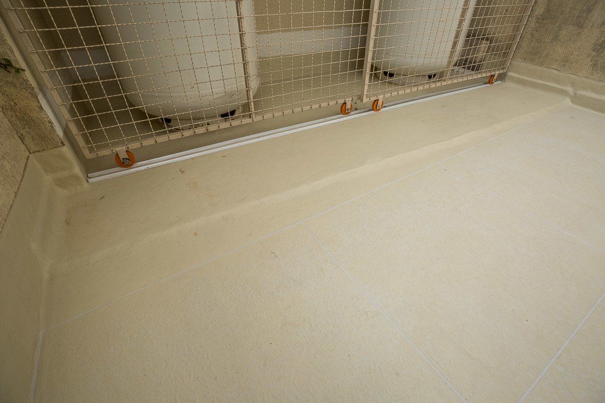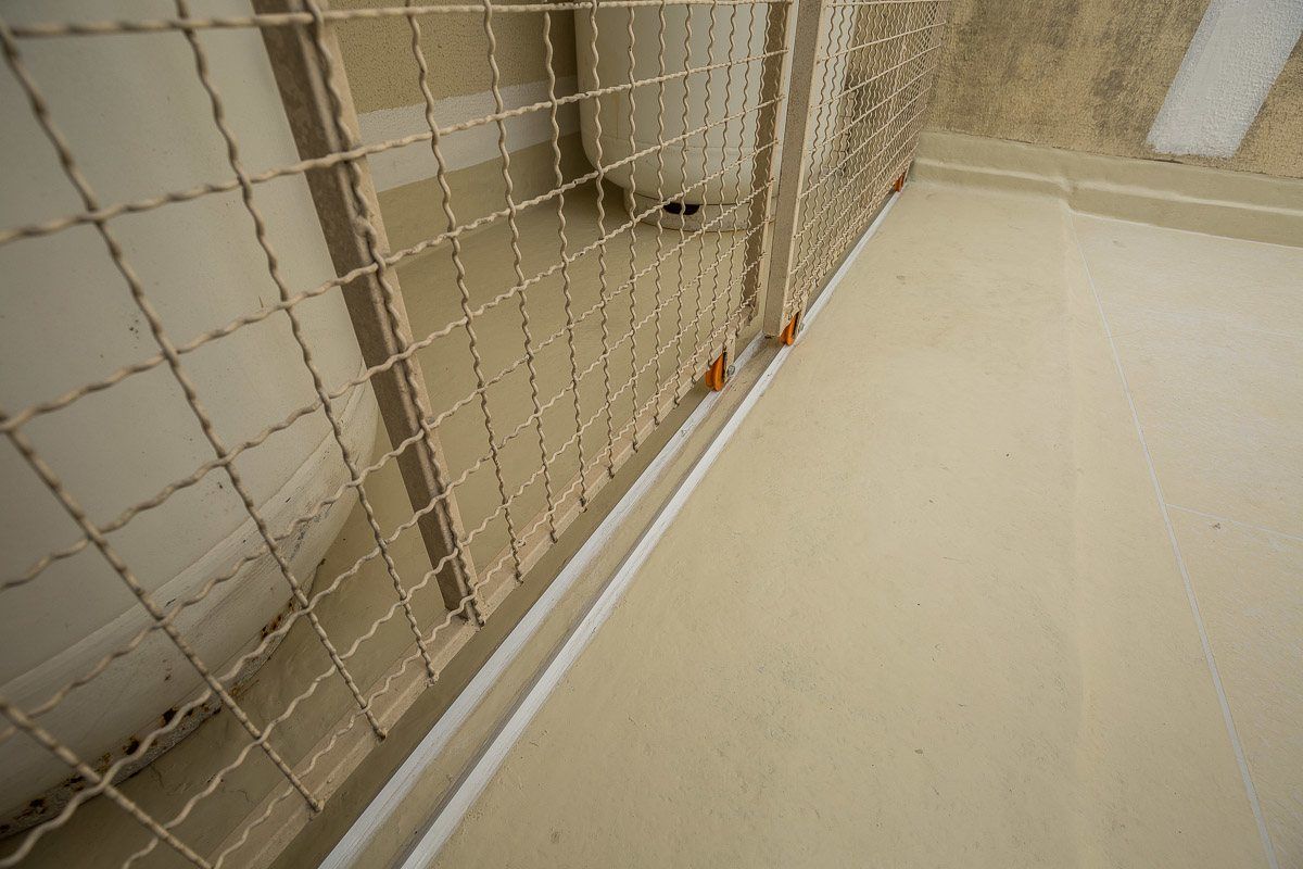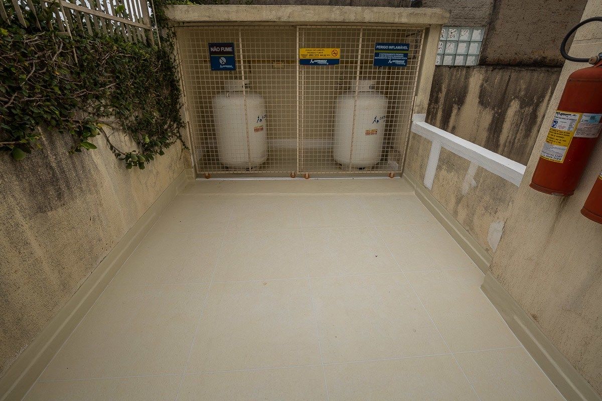 O piso recebeu o mesmo acabamento do terraço. O Sistema Fibersals garantiu que a impermeabilização fosse feita também na área de armazenamento do botijões de gás, uma área de difícil acesso que apresentaria impedimentos aos métodos convencionais.