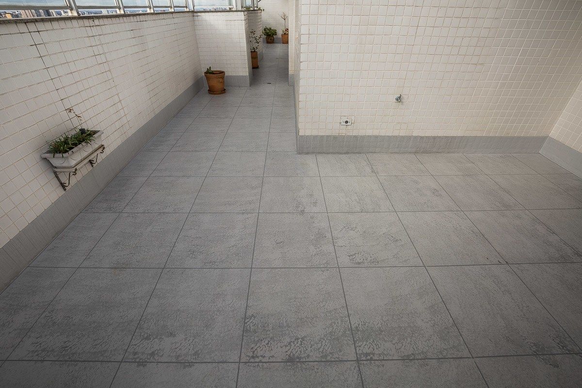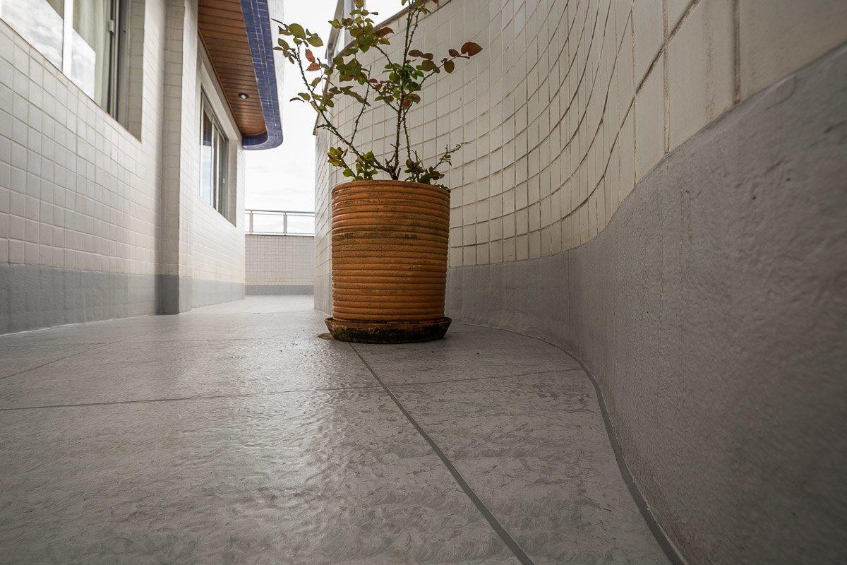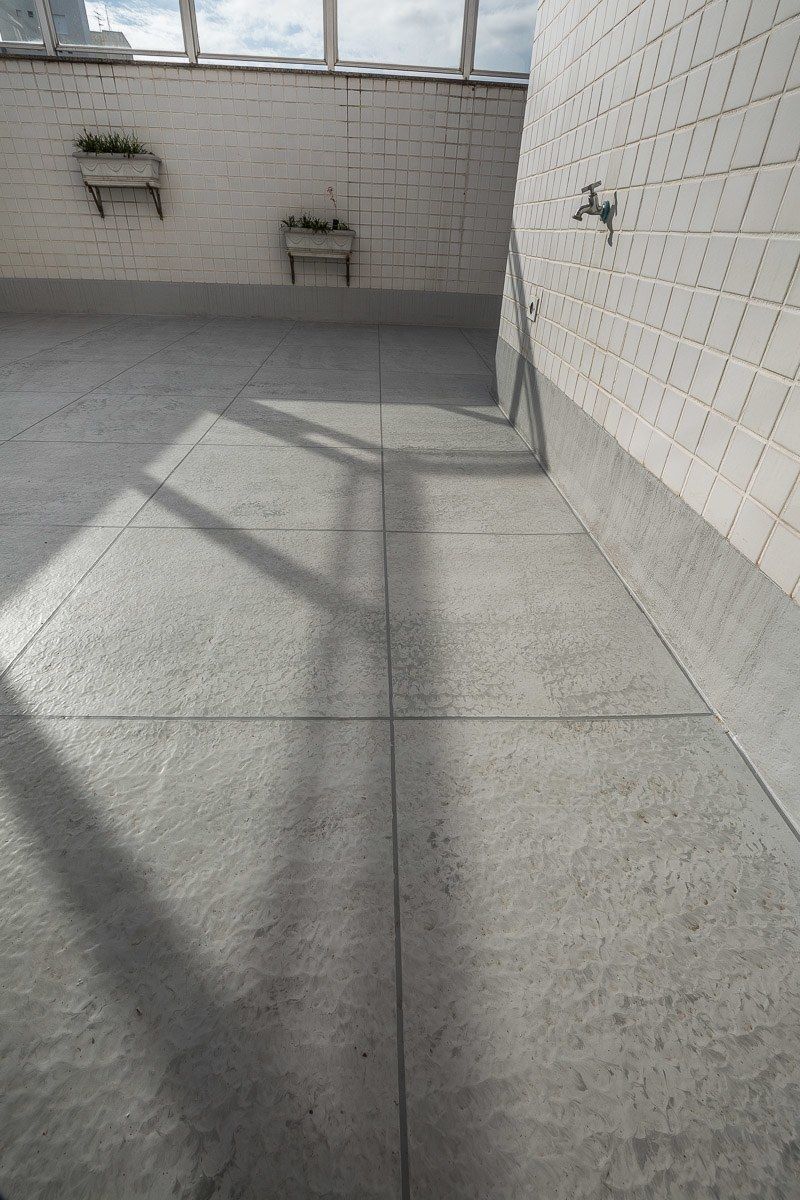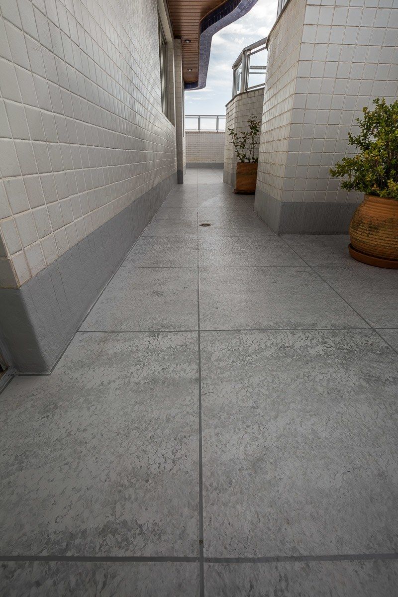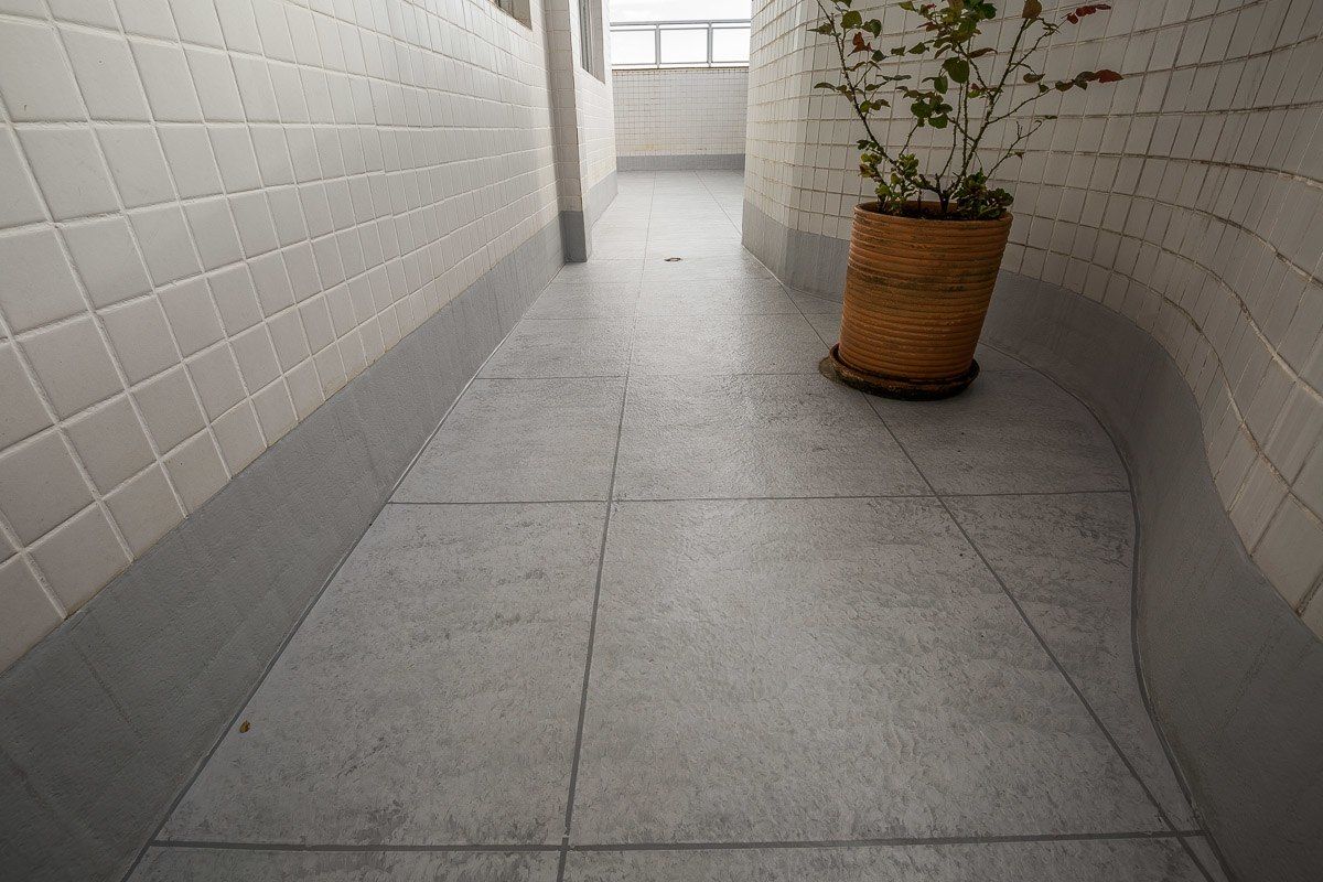 O acabamento escolhido pelo cliente foi uma imitação de cerâmica, com mescla de tons de cinza e diferenciação de rejunte. O resultado foi um terraço impermeabilizado, livre de infiltrações, e com aspecto renovado.