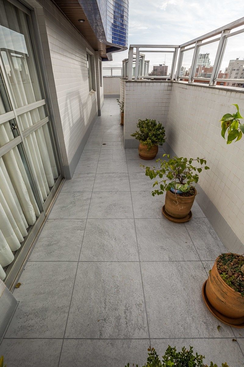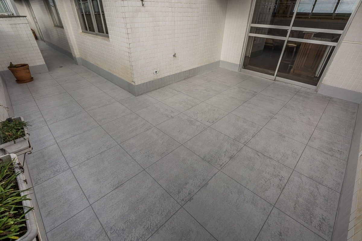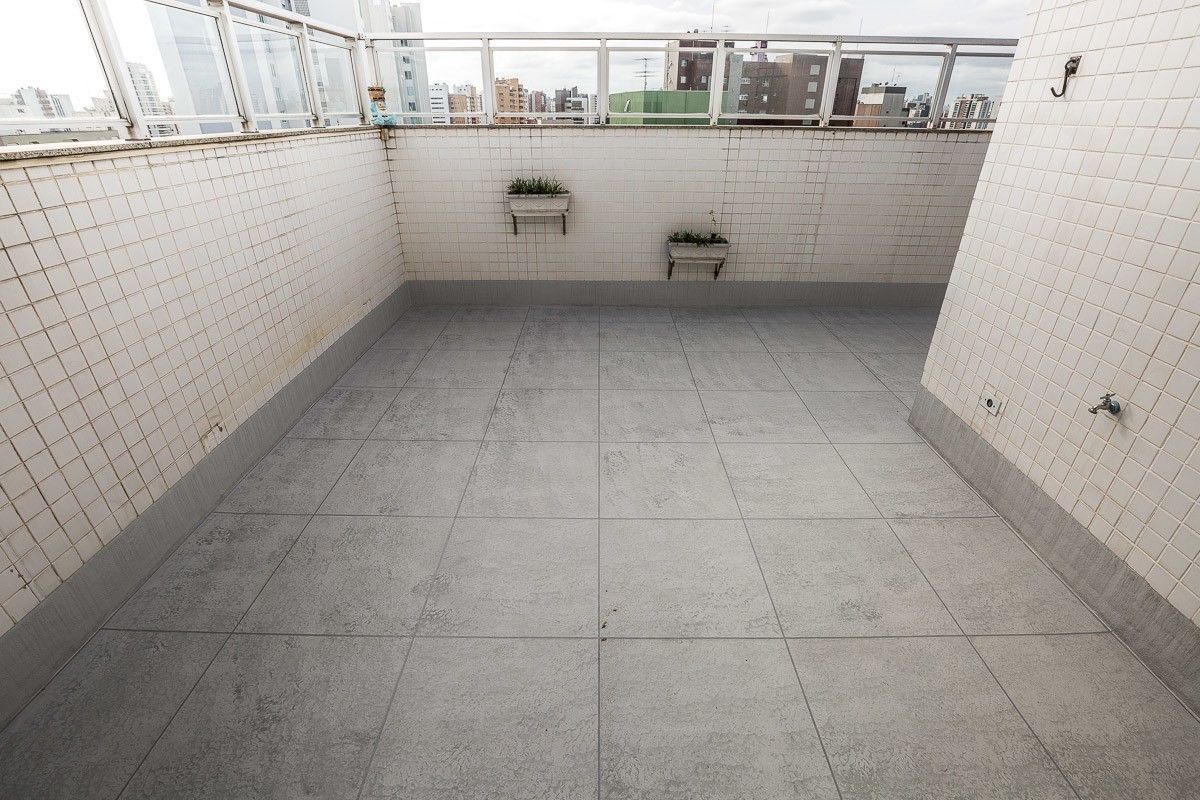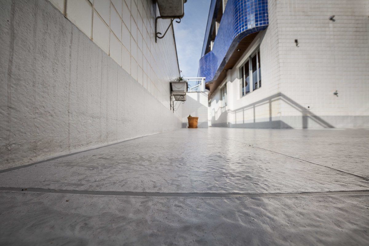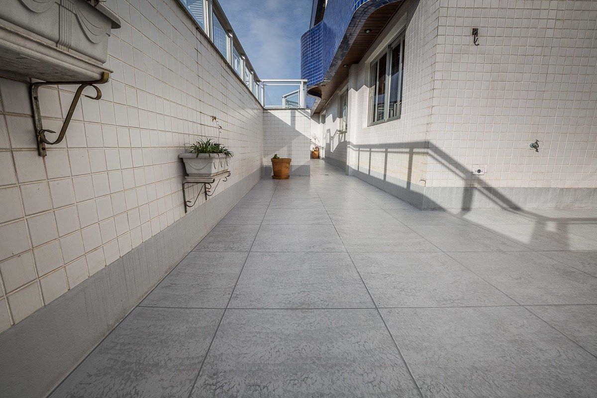 O acabamento escolhido pelo cliente foi uma imitação de cerâmica, com mescla de tons de cinza e diferenciação de rejunte. O resultado foi um terraço impermeabilizado, livre de infiltrações, e com aspecto renovado.